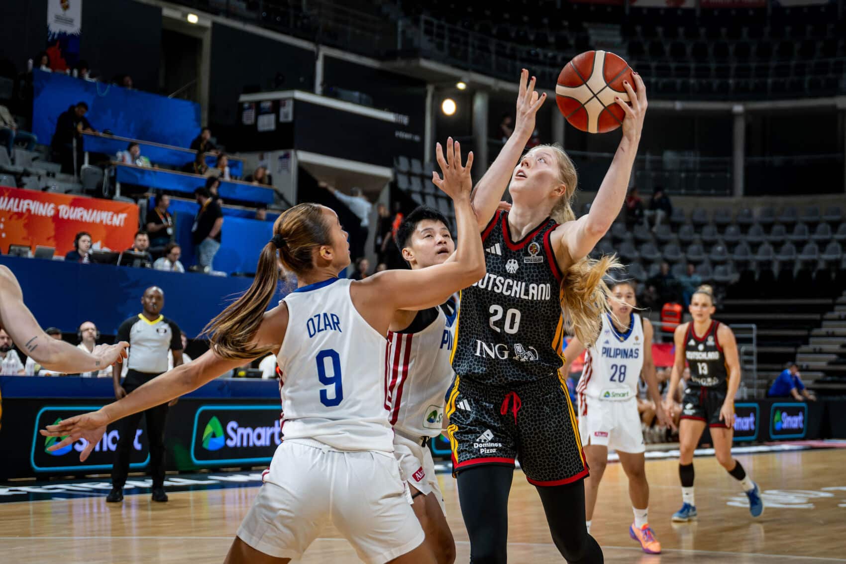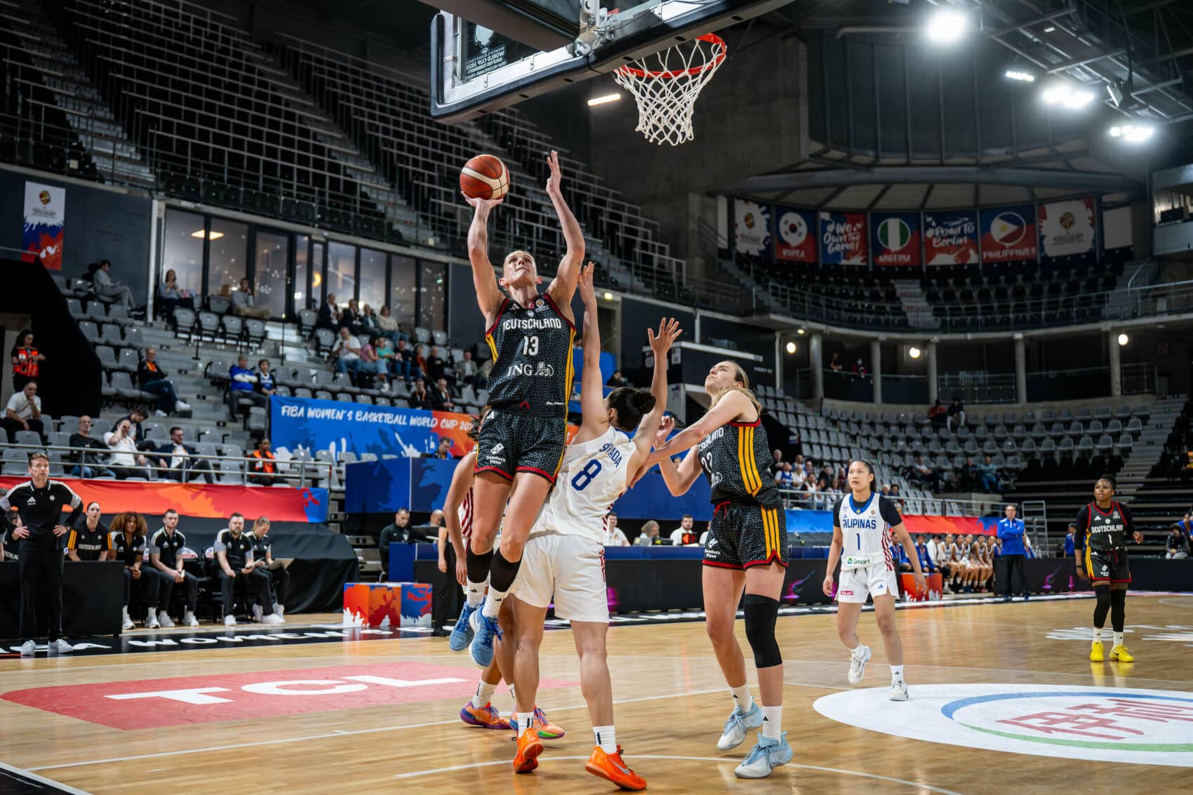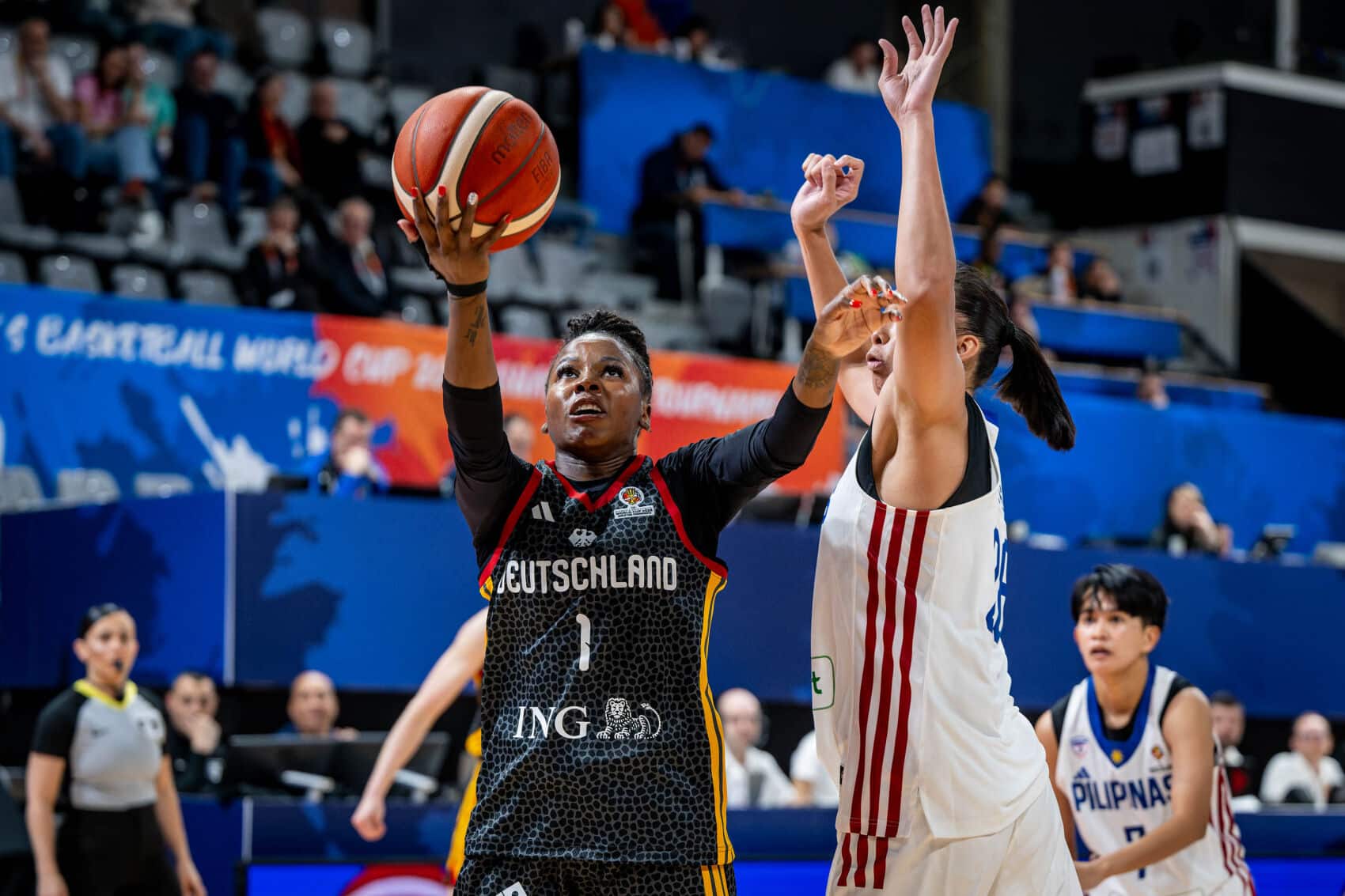 TonangebendLange schonte heute Nyara Sabally. Deutschland begann mit Alexis Peterson, Leonie Fiebich, Alina Hartmann, Frieda Bühner und Emma Eichmeyer. Schnell zeigte sich die klare körperliche Überlegenheit der DBB-Auswahl. Beim 9:2 (3.) nach Punkten von Bühner und Hartmann nahm der Gegner bereits seine erste Auszeit. Die durchweg einen Kopf kleineren Philippinas wehrten sich nach Kräften und versuchten durch Tempo und von außen zum Erfolg zu kommen. Deutschland blieb klar tonangebend und lag nach knapp sechs Minuten mit 18:9 in Front. Wenn man allerdings zu viel Platz gestattete und nicht voll aufmerksam war, hatten die Philippinen Erfolgserlebnisse (18:14, 7.). Emily Bessoir hatte starke Szenen und punktete per Dreier zum 27:16 (9.), aber ganz absetzen konnte sich die deutsche Mannschaft bis zum Viertelende nicht (35:25). Besonders defensiv hatte man einfach zu viel zugelassen.