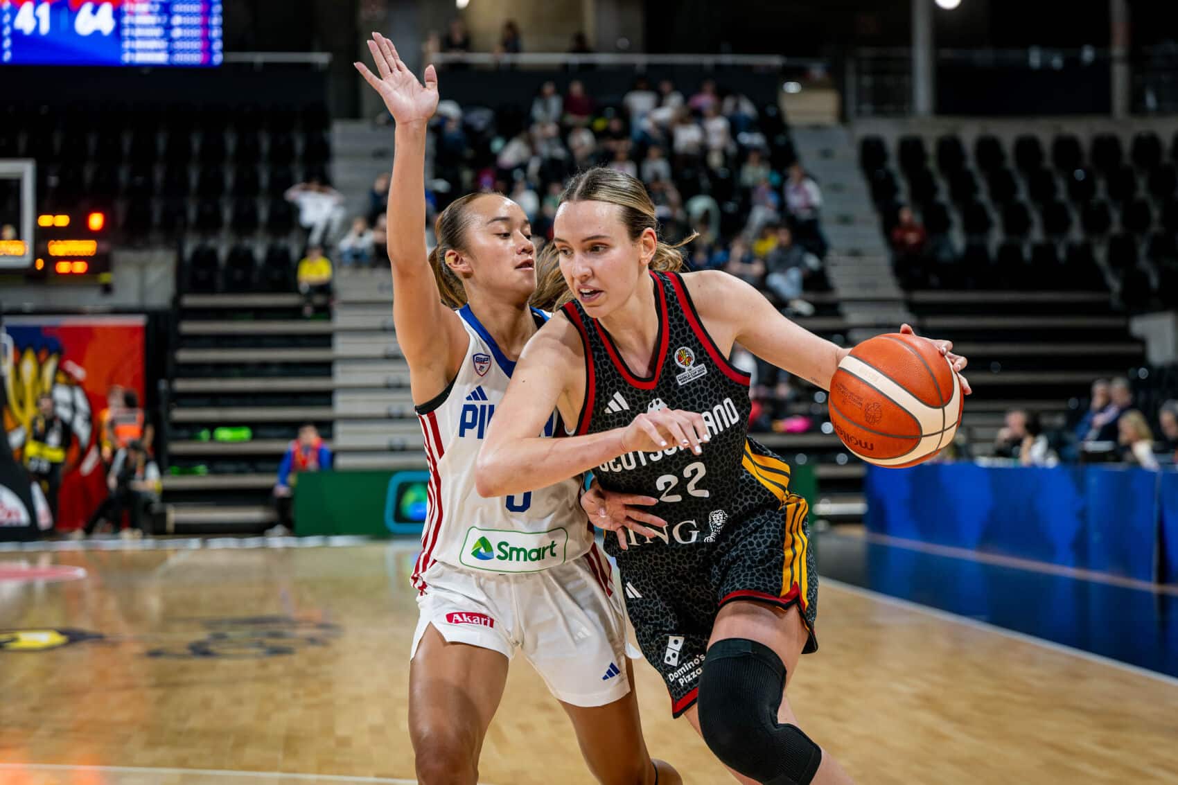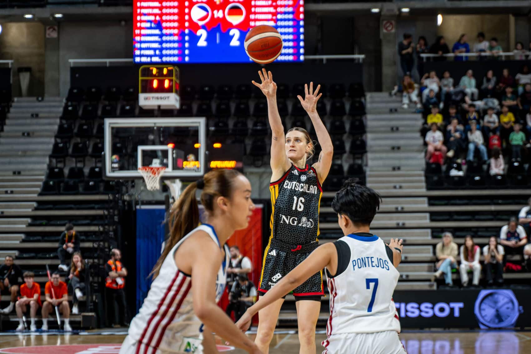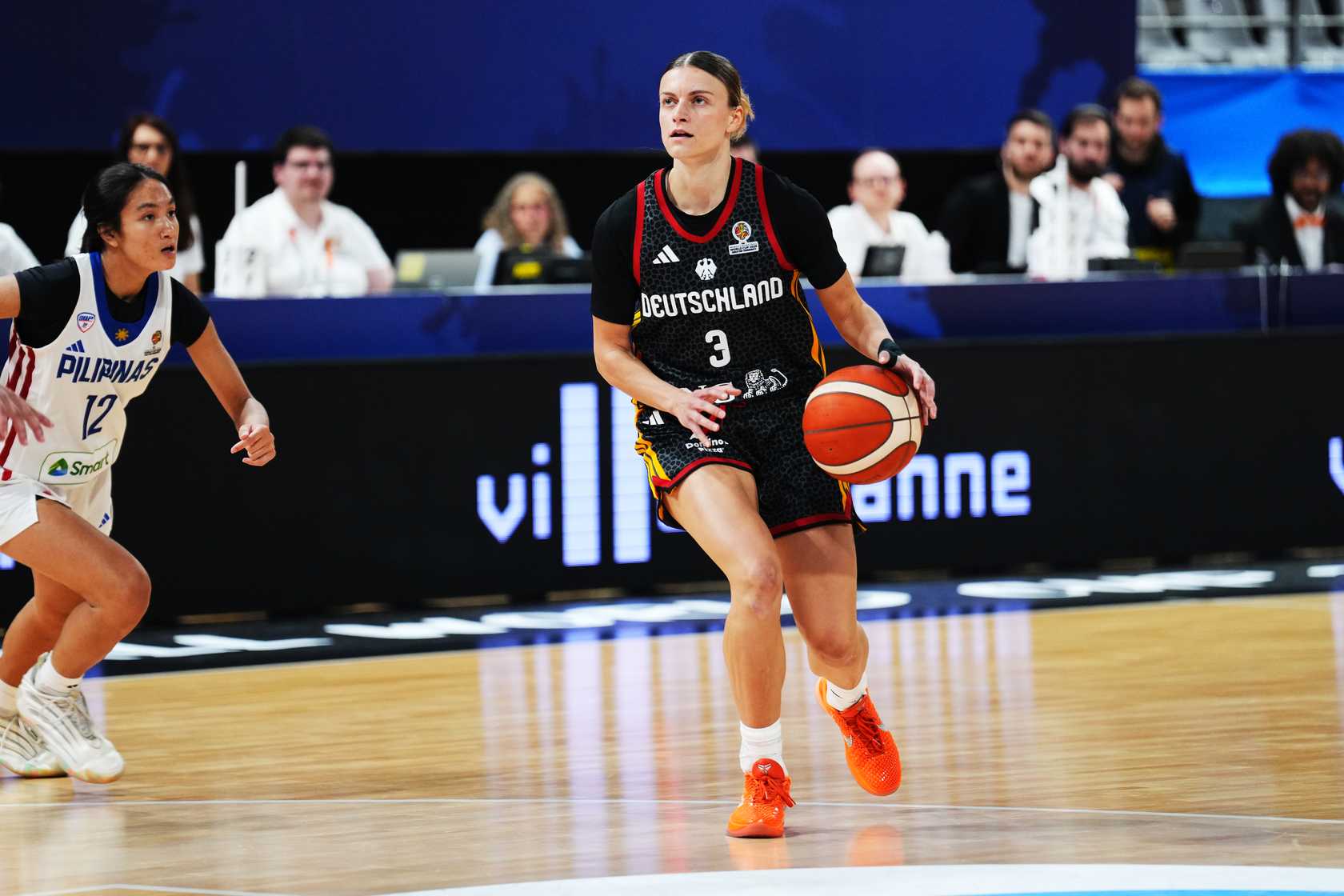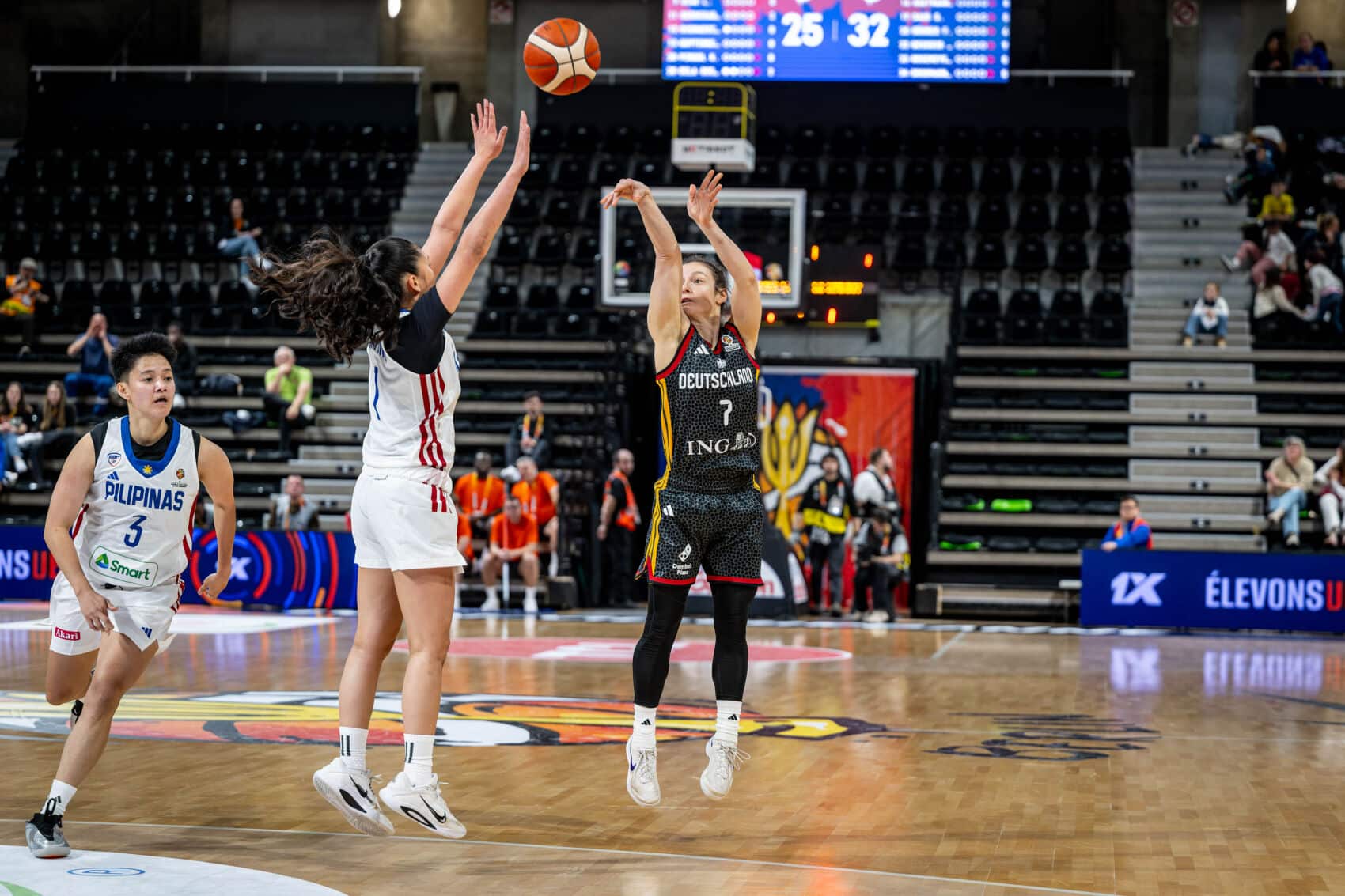 TonangebendLange schonte heute Nyara Sabally. Deutschland begann mit Alexis Peterson, Leonie Fiebich, Alina Hartmann, Frieda Bühner und Emma Eichmeyer. Schnell zeigte sich die klare körperliche Überlegenheit der DBB-Auswahl. Beim 9:2 (3.) nach Punkten von Bühner und Hartmann nahm der Gegner bereits seine erste Auszeit. Die durchweg einen Kopf kleineren Philippinas wehrten sich nach Kräften und versuchten durch Tempo und von außen zum Erfolg zu kommen. Deutschland blieb klar tonangebend und lag nach knapp sechs Minuten mit 18:9 in Front. Wenn man allerdings zu viel Platz gestattete und nicht voll aufmerksam war, hatten die Philippinen Erfolgserlebnisse (18:14, 7.). Emily Bessoir hatte starke Szenen und punktete per Dreier zum 27:16 (9.), aber ganz absetzen konnte sich die deutsche Mannschaft bis zum Viertelende nicht (35:25). Besonders defensiv hatte man einfach zu viel zugelassen.