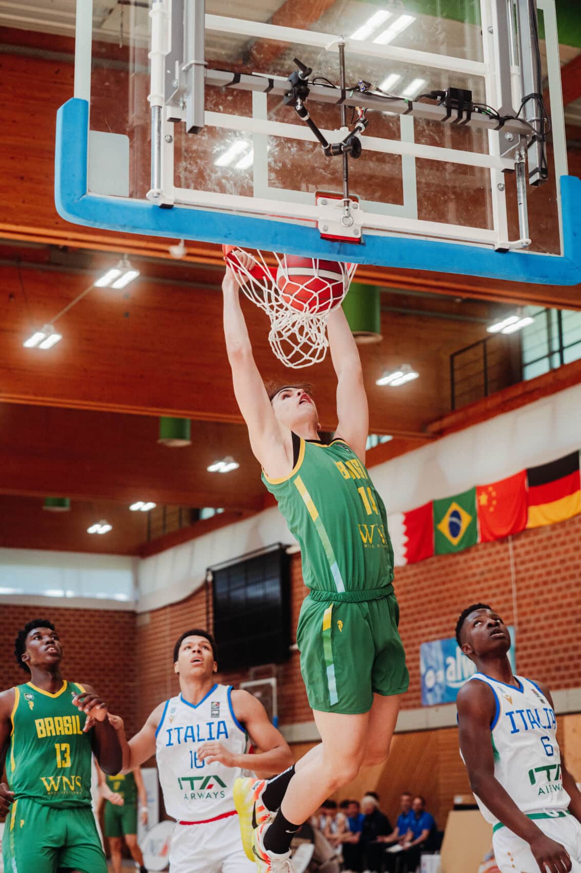 Zu Beginn leisteten sich beide Teams haarsträubende Passfehler, die besonders Brasilien nutzen konnte. Offenbar lähmte die Bedeutung der Partie die jungen Korbjäger etwas (5:9, 4.). Fortan ging es hin und her mit mehreren Führungswechseln (16:16, 8.). Beide Head Coaches arbeiteten sich lautstark an der Seitenlinie ab und übertrugen die Hektik aufs Spielfeld. Italien versuchte es mit frühem Doppeln im Vorfeld und übte damit defensiv den größeren Druck aus (22:16, 11.). Drei Dreier brachten Italien mit 33:22 in Front (14.). Bis zum Kabinengang blieben die Azzurri die klar bessere Mannschaft (46:34).