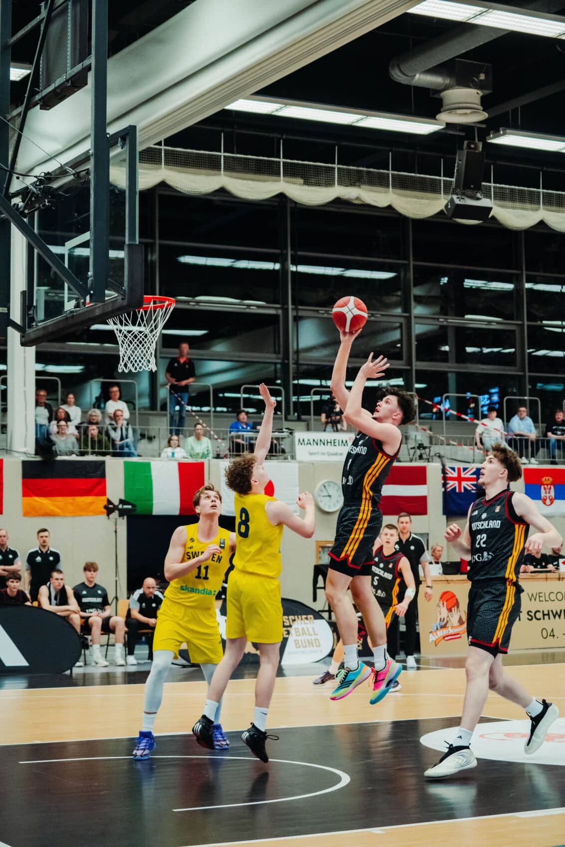 Frühe VorentscheidungDeutschland war nach der Pause um eine schnelle Entscheidung bemüht. Immer wieder kam man zum schwedischen Korb, punktete entweder direkt oder war nur durch Fouls zu stoppen. Ein glänzender Fastbreak, abgeschlossen durch einen starken pass von Edoka auf Kemmer, führte erstmals zu einer 20-Punkte-Führung (61:41, 24.). Phasenweise spielte die deutsche Mannschaft wie aus einem Guss und überzeugte das Publikum in der GBG Halle in Mannheim. Die Dominanz wurde eher noch stärker und beim 68:43 durch Kenan Youdom (27.) war bereits eine Vorentscheidung gefallen, auch wenn sich hier und da Unkonzentriertheiten einschlichen, die Ibrahimagic so gar nicht gefallen wollten.