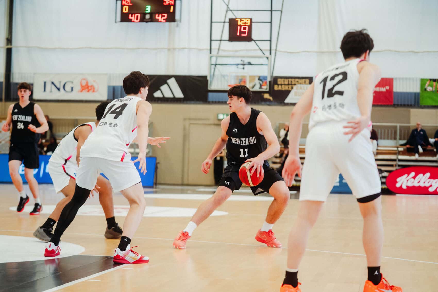 In the matchup between the two teams from opposite ends of the world, things were even early on (7–7, 3rd | 12–12, 6th). New Zealand’s superior physicality then seemed to take over (17–12, 7th), but that didn’t last. Japan responded—sparked in part by a four-point play—to take the lead and extend it to 29–23 (13th). New Zealand struggled to get a grip on the game and still trailed 39–35 at halftime.