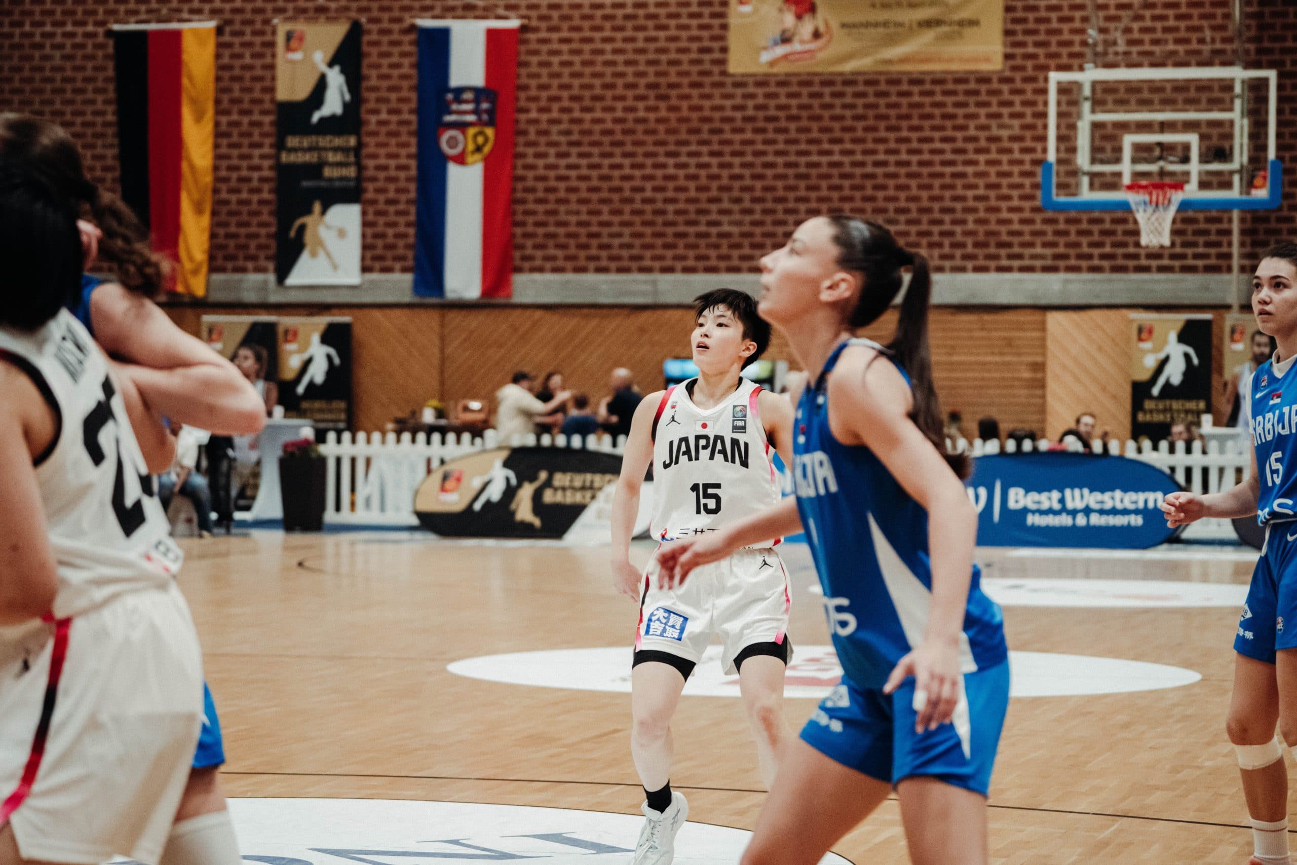 Das letzte Spiel in Viernheim war das Spiel um den Gruppensieg der Mädchen. Beide Teams hatten zuvor beide Spiele gewonnen und gingen auf Augenhöhe in die Partie, was man auch merkte. Das erste Viertel war recht ausgeglichen, auch wenn Japan mit einer leichten Führung das erste Viertel beendete (14:11). Die Japanerinnen nahmen danach Fahrt auf und kamen auf einen zehn Punkte Vorsprung, doch die Serbinnen kämpften weiter und kommen auf 24:22 ran (18.). Die Japanerinnen übernahmen aber wieder die Kontrolle und konnten zur Pause auf 28:22 stellen.